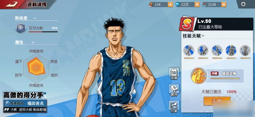 福田也是陵南所有正选球员中,最后一个在游戏中出场的人员,众所周知福田是神奈川数一数二的进攻型大前,很多的防守球员都无法防住福田。进攻如此犀利的福田到底该如何使用呢?下面就来给大家介绍下技能使用技巧。