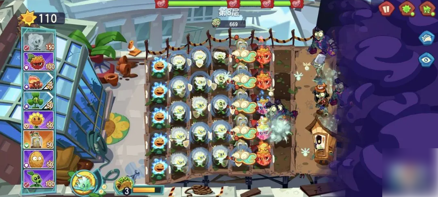 用这套阵容打到打不过为止,直到出现一个新的僵尸,园艺僵尸,这个僵尸拥有斩杀效果,这个时候就要变阵容,阵容变为