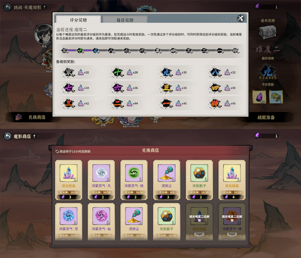 打评分上升时会送一次性的造化结晶奖励。前期靠送的就够用了。实在不够用再从商店里买。