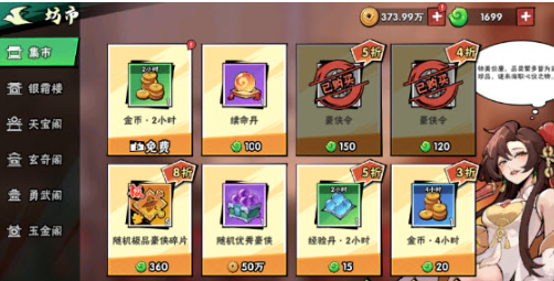 1、集市:优先购买5折以下的豪侠令、英雄令,5折突破丹、6折无字天书,以及所有可用金币购买的道具。