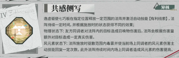 风元素状态:法阵施放时驱散毒雾,提升当前场上同调者的风元素伤害,并回复主动技能次数,持续时间内场上同调者风元素伤害提高。