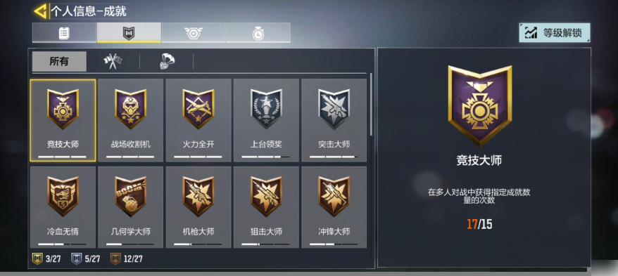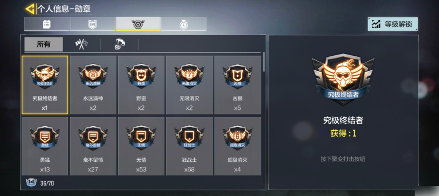 另外还有一个位置是勋章,顾名思义,玩家可以在这里查看到自己所取得的勋章,主要是通过连环射杀或者是特殊射杀等情况所获取的,所以说,勋章是需要玩家通过自己精湛的枪法和战斗一一解锁的哟!