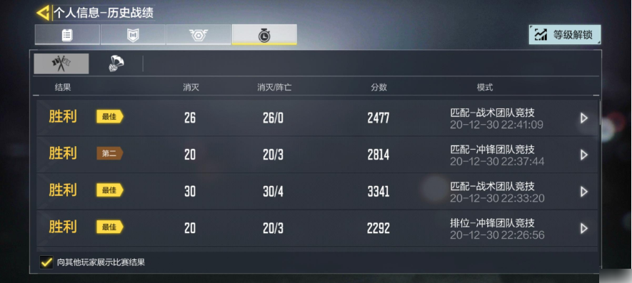 再有就是战绩了,玩家可以查看自己进行的所有战斗的成绩的,得分或者是消灭人数,玩家也可以通过这些总结自己的不足,从而实现更技术的自己。