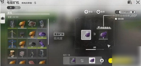 矿机的基础是手动采集,容量上限30单位,超过后自动停止。升级电驱模块后,矿机将获得自动传输功能并提升40%采集速度,但需要稳定电网覆盖,每台电驱矿机需消耗5单位电力,后面可以搭配地热发电机进行供电。