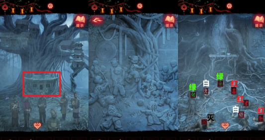 纸嫁衣8千子树第五章蜡烛颜色谜题怎么解,进入树根区域正下方的庙,点击右上角的浮雕获得甲骨文位置线索,根据之前的六葬雕像甲骨文颜色线索,开始解开蜡烛颜色谜题。娃娃手中的蜡烛有红绿白三种颜色和熄灭4个状态,正确的状态可以参考下图。