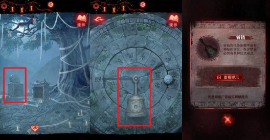 【聂莫黎视角】进入树根区域的塔内,点击画面中间的大钟,在道具栏选择【铃铛】放在没有铃铛的铁链上,获得铃铛图案线索。
