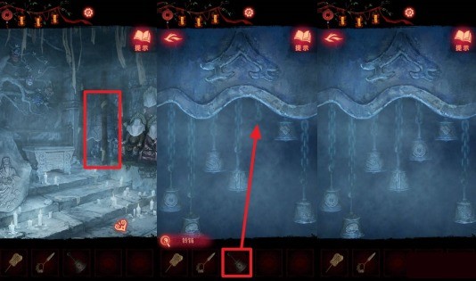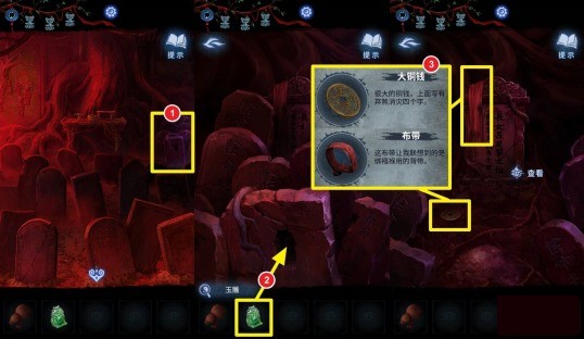 【聂莫琪视角】解开墓碑贡品谜题后,庙内红雾散去,点击画面右侧有空洞的墓碑,在道具栏选择【玉雕】(解开纸娃娃面具谜题获得)放入空洞,拾取【大铜钱】和【布带】。