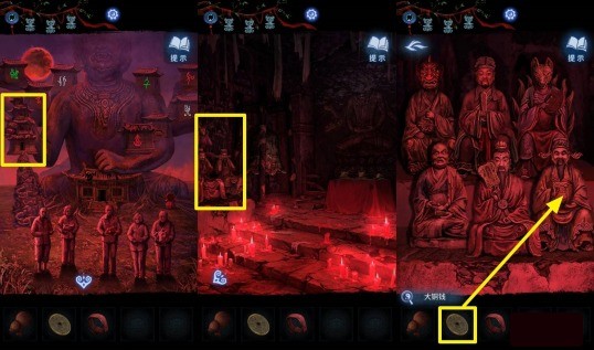 【聂莫琪视角】进入六葬雕像左侧的塔内,点击画面左侧的雕像,在道具栏选择【大铜钱】放入右下角雕像手中。