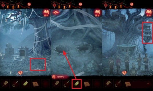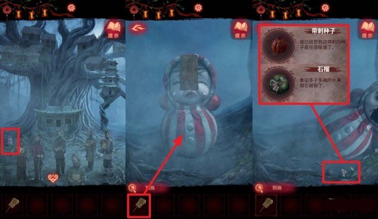 【聂莫黎视角】切换到聂莫黎视角,来到树根区域,在树根左侧树下之前被埋在土里的不倒翁现在已经起来了,在道具栏选择【铜扇】点击不倒翁,触发小游戏,先看不倒翁上贴的符咒的晃动方向,然后点击对应的方向按键晃动不倒翁,嫌麻烦可以跳过。完成小游戏后获得【带刺种子】。