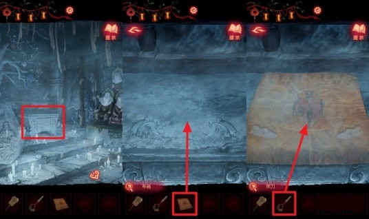 【聂莫黎视角】进入塔内之后,点击画面中间的供台,在道具栏选择【布画】放上供台,再选择【师刀】点击布画。