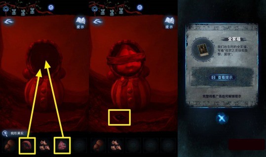 【聂莫琪视角】在道具栏中依次选择【桃形果实】和【布条】放在不倒翁上,获得【全家福】。