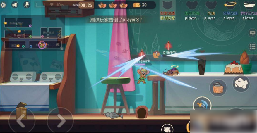 剑客汤姆抓老鼠可以尽量将老鼠打出震慑效果,这样能够加速自己的放飞效率,抓到老鼠后,可以举起武器技能盾牌靠近火箭,防御的同时还能加大自己的视野。