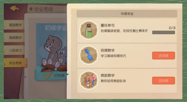 接下来,我们将迎来《猫和老鼠》手游的“中学时代”——中级学业。为了顺利获得中级学业证书,您需要完成一系列挑战性的任务。这些任务包括:首先,以猫或老鼠的身份参与游戏,并成功赢得任意模式的比赛三次;其次,深入学习投掷技巧,掌握高级投掷方法;最后,了解并实践救助队友的技巧。