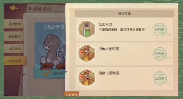 接下来,您将面临高级学业的挑战。要获得高级学业的证书,您需要完成一系列任务,包括扮演猫或老鼠并赢得任意比赛5次,完成经典之家赛跑任务,以及完成雪夜古堡赛跑任务。这些挑战将测试您的游戏技巧和策略,让您在探索雪夜古堡地图的同时,不断提升自己的游戏水平。