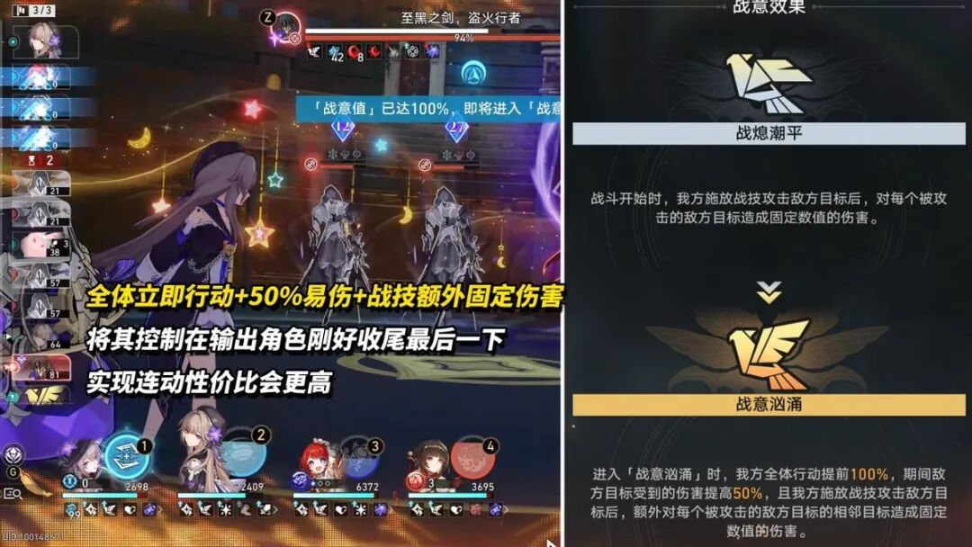 战意汹涌效果:进入该状态时,我方全体行动提前100%,敌方受伤害提高50%,战技可对相邻目标造成固定伤害。