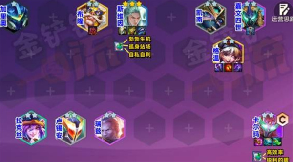 稳住阵容后,5-5至6-1阶段升9级,补强格温与布隆。若乌鸦牌量充足,可考虑追三星,但避免硬追浪费经济。选秀时优先为格温补足装备,阵容完全成型后,基本能稳进前二。