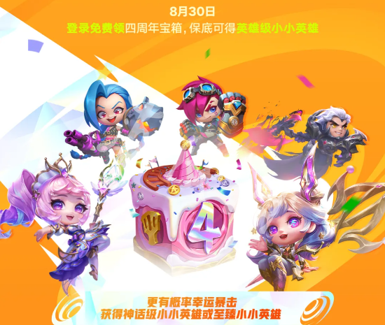 - 在8月30日当天登录游戏可免费领取四周年宝箱,至少能获得英雄级小小英雄,有机会获得神话级或至臻小小英雄。(每个账号限领一个)