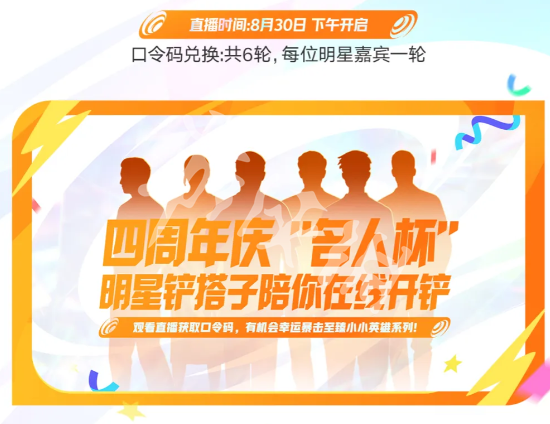 - 从8月30日下午开始,观看金铲铲之战官方直播间的四周年“名人杯”直播,可领取口令码福利,共有6轮。