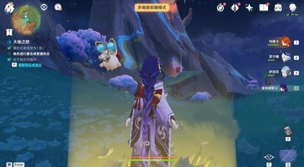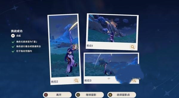 2.传送到留影点附近的传送锚点后,前往留影位置。切换出一名雷元素角色,与留影点互动,根据喜好进行调整,同时查看界面左侧是否符合留影要求。