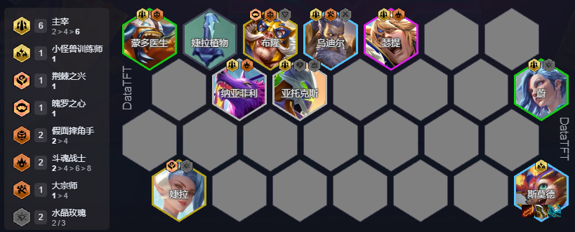 后期(8级):补充斗魂羁绊,增强整体坦度,完成阵容最终形态。