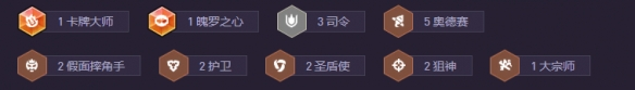 - 组合羁绊包括:1卡牌大师、1魄罗之心、3司令、5奥德赛、2假面、2护卫、2圣盾使、2狙神和1大宗师。
