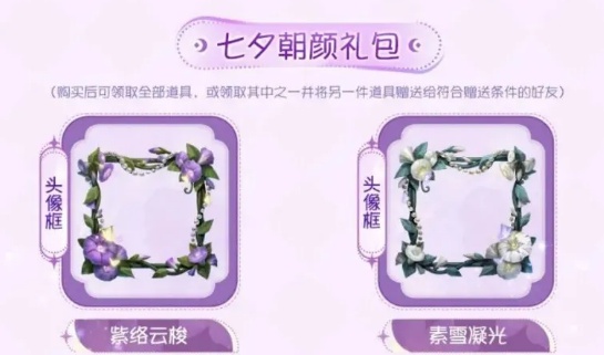 七夕朝颜礼包:含头像框“紫络云陵”“素雪凝光”,支持领取全部或拆分赠送好友,情侣头像框助力庄园浪漫互动。