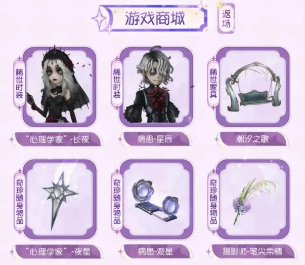 稀世时装:“心理学家”-长夜与“病患”-星辰情侣皮肤回归,预计2888回声或12888紫薯兑换;“渔女”-潮汐之歌稀世家具同步返场,约11688线索可购,为归宿增添唯美双人场景。