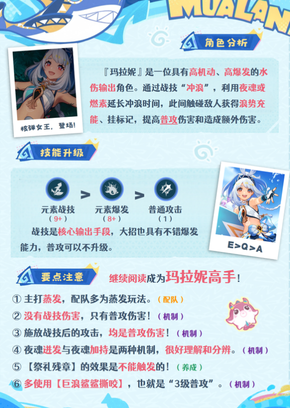 1.作为水系蒸发主C,玛拉妮依托水打火2倍蒸发倍率优势,能打出高额伤害。其输出依赖元素战技强化普攻与元素爆发的协同,形成低频高伤的战斗循环。