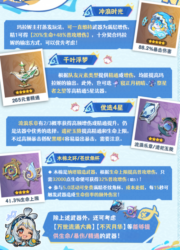 1.五星首选:专武「冲浪时光」(20%生命+48%普攻增伤,完美适配生命倍率);次选「万世流涌大典」(需控制暴击率避免溢出)。