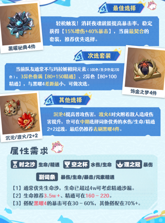 2.词条优先级:双爆(暴击率/伤害)>生命值>元素精通,无需堆充能(大招60能量易循环)。