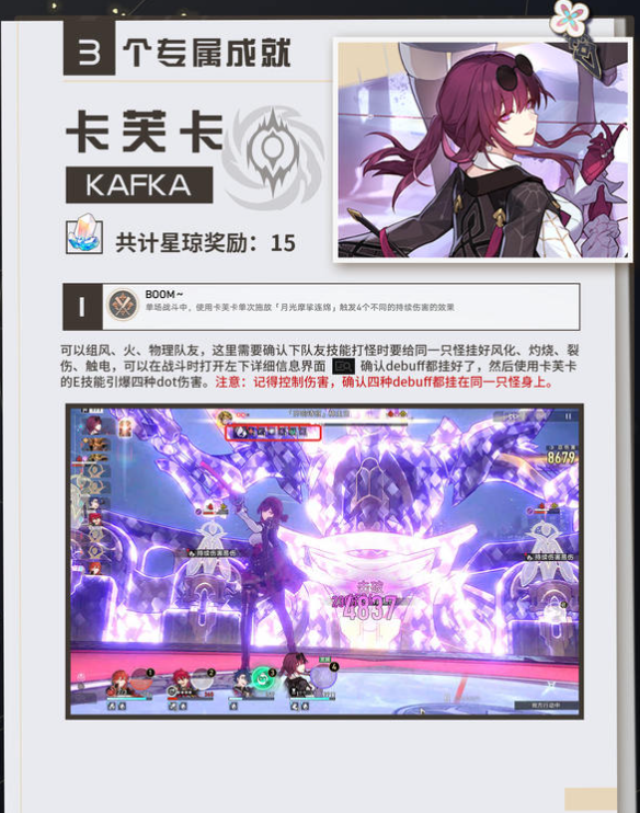 1.单场战斗中,使用卡芙卡单次施放【月光摩挲连绵】触发4个不同的持续伤害效果。可在常规战斗关卡中完成,建议选择怪物生存能力较强的场景。