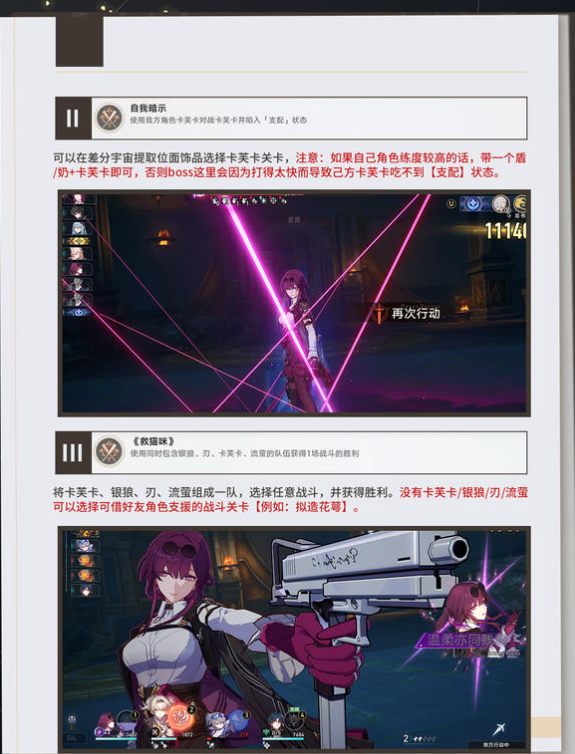 2.完成方法:如果自身角色练度较高,组队时搭配一个护盾角色或治疗角色加卡芙卡即可。这样的组合能避免因输出过高导致战斗过快结束,从而让卡芙卡有足够时间获得并维持【支配】状态,顺利完成该成就条件。