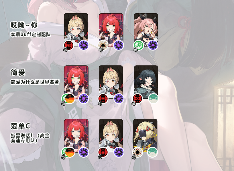 靠着与薇薇安的搭配强势上位。其队伍构建相对固定,辅助一般在耀佳音和凯撒中选择,且耀佳音更为顺手。在当前危局版本中,虽然没有物理弱点,简一直处于逆风局,但未来一旦环境有利于物理属性,简有望展现出更强大的实力,目前其在队伍中的表现也相当稳定且出色。