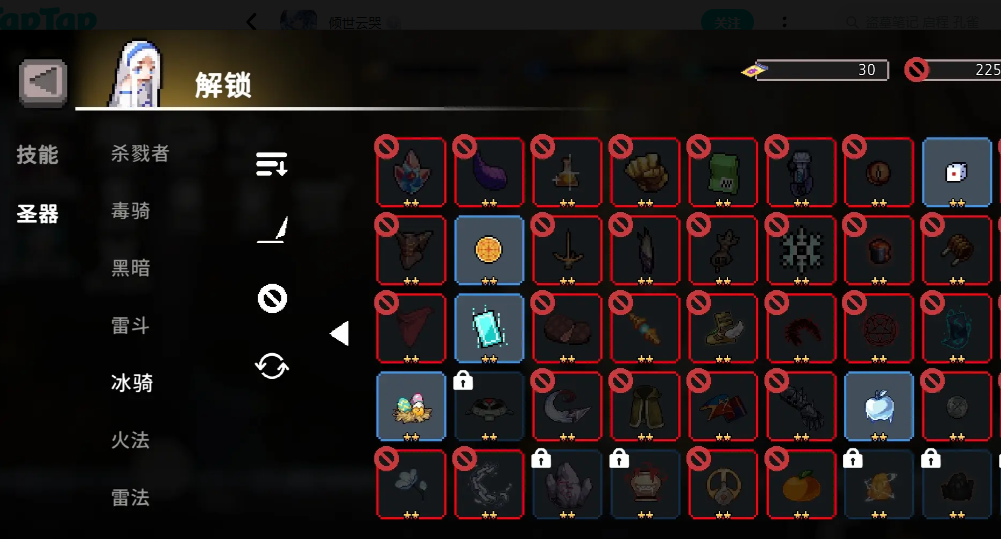 白色面具需将护盾改造成4星解锁,永生剑则是在不受到生命值伤害的情况下打赢骷髅BOSS解锁。二者配合能提供巨额攻击力,大幅提升角色的输出能力,但永生剑一旦装上就无法取下,所以在圣器槽未满时,切勿捡起永生剑。前期可以用冰矛和尼夫海姆金币代替这两个圣器过渡。