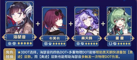 卡芙卡作为DOT引爆核心,黑天鹅提供额外DOT伤害,藿藿负责生存保障,海瑟音则强化挂DOT和增伤能力。