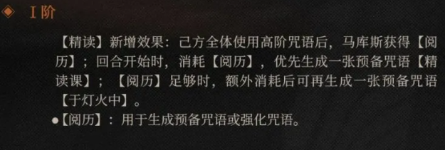 回合开始时,消耗“阅历”可生成预备咒语,阅历可通过己方全体使用高阶咒语积累。高阶咒语生成概率提升,更易触发高阶技能循环。