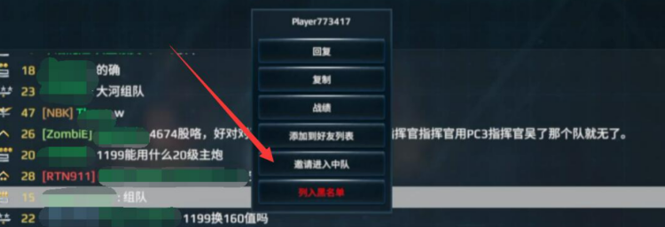 1.当你在游戏的聊天室或者公屏浏览信息时,如果看到有玩家的游戏表现吸引了你,或者单纯想邀请一位路人玩家组队,你可以点击该玩家的头像。点击后会弹出一系列选项,在这些选项中,选择“邀请加入中队”,即可向对方发起组队邀请。