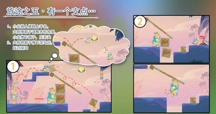 合作解谜:利用小龙的跳跃能力,配合大胖的力量,推动箱子、调整机关,开辟通路。