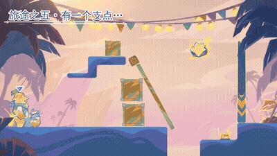 1、小龙搭人梯跳上平台, 大胖推箱子调整木杆角度,小龙推下箱子,压开关。