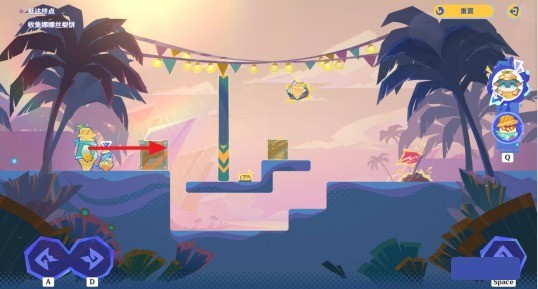 2.推动箱子解锁通路:操控小龙往右走,沿着路线绕到平台上方小箱子所在位置,将小箱子推到机关上。此时,挡板会被挪开,为大胖开辟出通路。