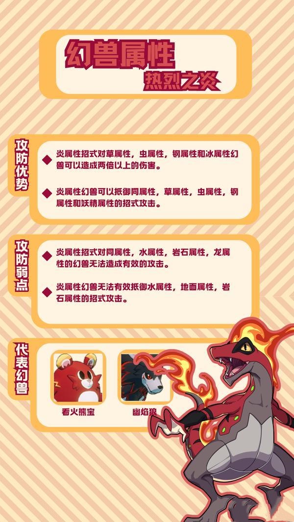 1.在攻击方面,炎属性招式威力不容小觑。当面对草属性、虫属性、钢属性和冰属性幻兽时,能造成两倍以上的伤害,轻松压制这些属性的对手。