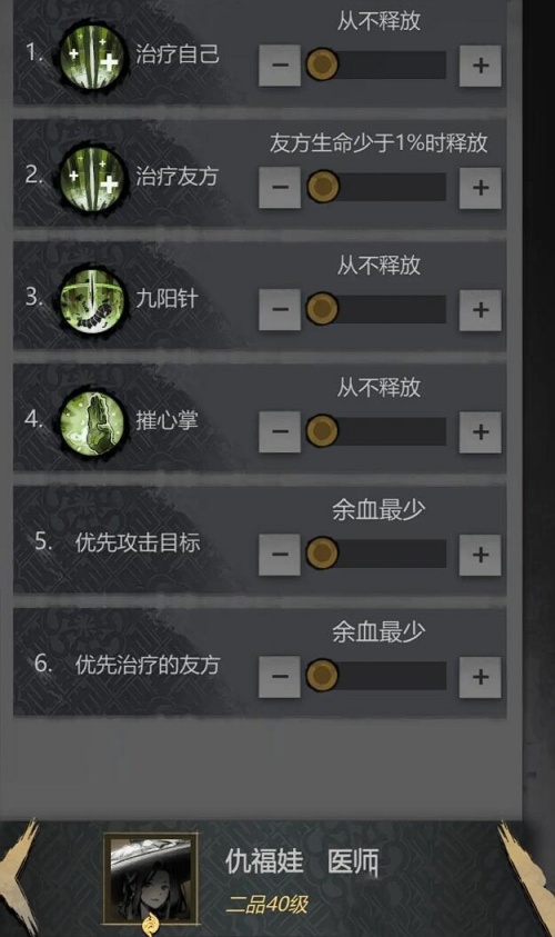 3.药师:在这套阵容中依旧扮演着保障团队生存的重要角色。通过释放九阳针等治疗技能,药师可以为队友恢复生命值,确保团队成员在面对傀儡敌人的攻击时能够保持良好的状态。在特殊副本中,战斗往往比较激烈,队友们容易受到伤害,药师的治疗能力就显得尤为关键,他的存在是团队能够顺利通关特殊副本的重要保障。这套阵容针对性极强,在面对特定的傀儡副本时能够发挥出巨大的优势。但由于其适用场景较为单一,非必要时可暂不培养,等到遇到需要应对大量傀儡敌人的副本时,再投入资源进行培养。