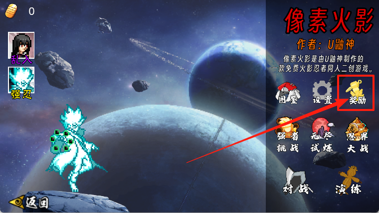 1. 打开像素火影2025游戏,点击右侧的“奖励”。