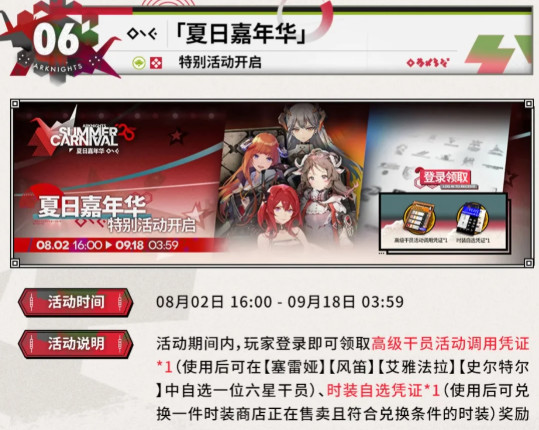 《明日方舟》 2025年夏日嘉年华活动8月2日就将开启了,官方此次发布了重磅福利,玩家登录即可选择风笛、塞雷娅、史尔特尔和艾雅法拉中的一位六星干员进行培养,该自选机制属于限时福利,错过活动期将无法获取对应干员,肯定有不少小伙伴还在纠结到时候选择哪一个六星干员,所以接下来就由小编为你带来明日方舟六星自选攻略,希望可以帮助你解决这个困恼。