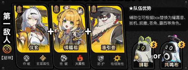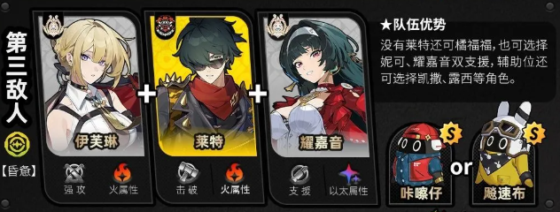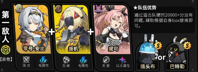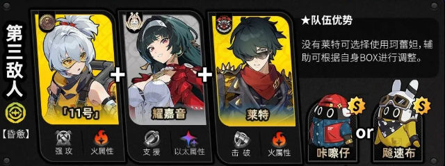 第三个是【恶名·庞培】,施加异常可消除增益,并触发【极限支援】额外加分,外加火属性弱点,推荐使用简妮、伊芙琳、简薇,以及11号进行作战。