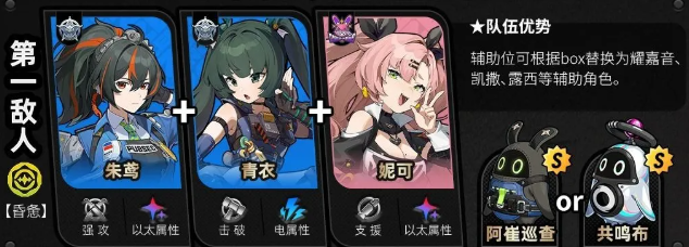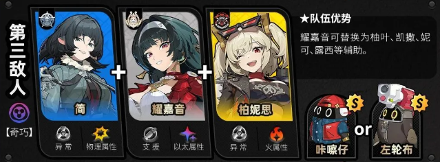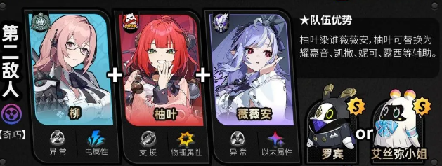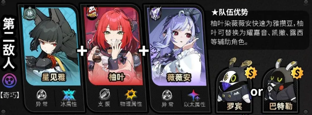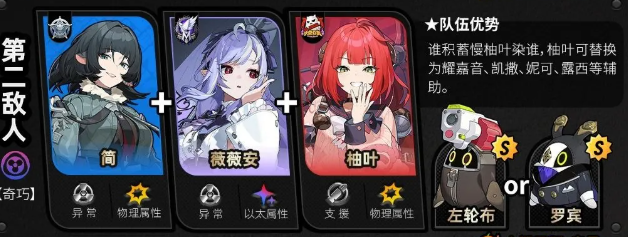 第二个配队出现了新BOSS【秽息妖鬼·名可名】,敌人每次进入属性异常,代理人对其造成的异常伤害提升,外加上物理与以太弱点,这就是为简、薇薇安等异常角色准备的。最优配队当然是简+薇薇安+柚叶,没有柚叶可用耀嘉音来代替,没有简,也可选择星见雅+薇薇安+柚叶、月城柳+薇薇安+柚叶。