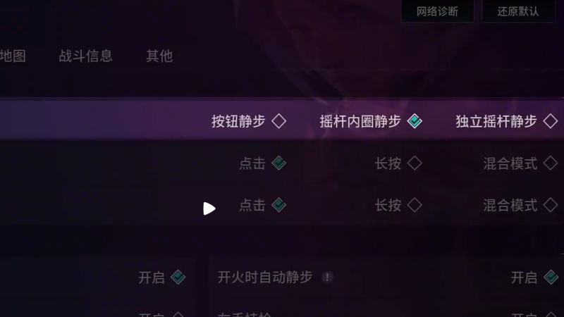 1.静步与开火:开“按钮静步”防误触,启“开火后取消静步”增流畅度。推荐将技能键拖动至屏幕上方,方便食指快速点击。基础操作布局里,左屏虚拟摇杆控制移动,右屏集中射击、跳跃等按键,建议新手先在训练场熟悉默认布局,再逐步尝试三指操作提升反应速度。