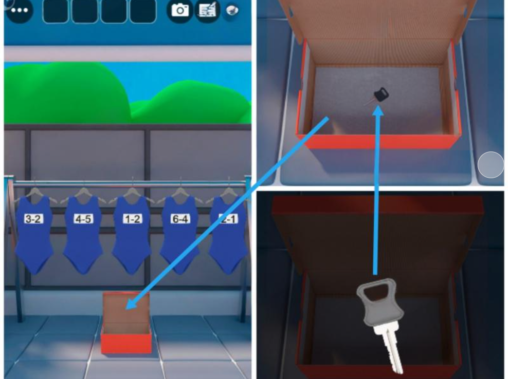 调整泳衣位置:根据泳衣上的号码,结合在更衣室场景表格上的线索来调整泳衣的位置。例如,若表格上显示的号码对应位置关系为“从左到右:3-2、4-5、1-2、6-4、2-1”,则按照此对应关系调整泳衣在架子上的位置。调整完成后,打开地上的盒子,获得【钥匙】。