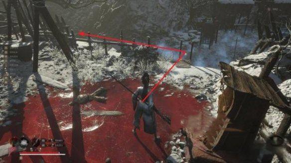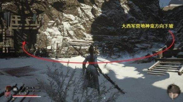 1、从【云顶城-大西军营地】的神龛出发,下梯子,对着梯子往右手边的小道下坡。注意要小心地雷。