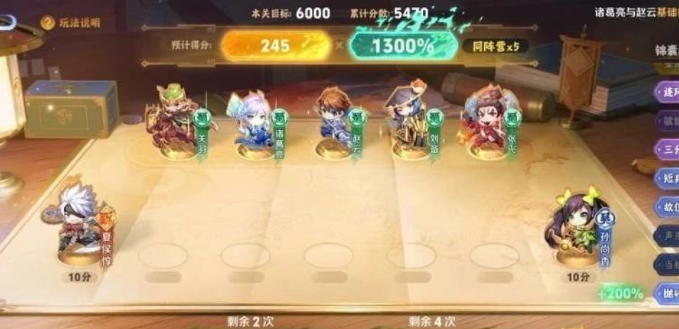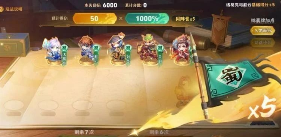 另外还有一个小窍门:每一关都会有特定棋子带有额外加分奖励。比如这一关诸葛亮有+5分加成,那你就要优先考虑蜀国阵容。